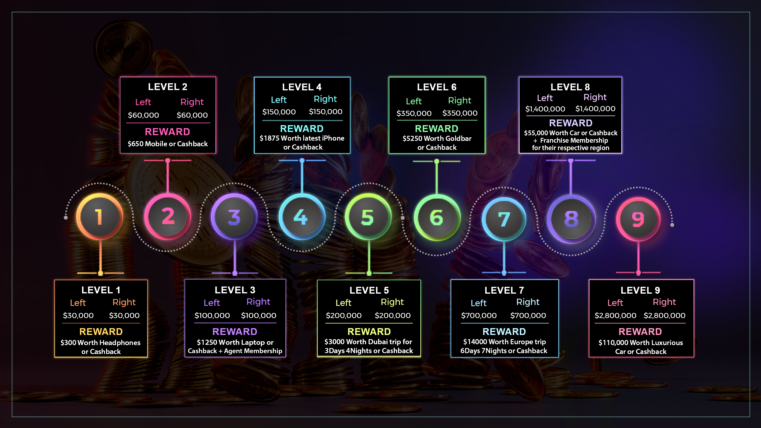 BI, which means for two, suggests that your account will have two teams: a left team and a right team. These teams are formed by combining your Left and Right. Binary profits can help you achieve steady income, mutual benefit, and continuous revenue. The purpose of binary income is to provide users with consistent income from affiliates and user groups in their network tree.